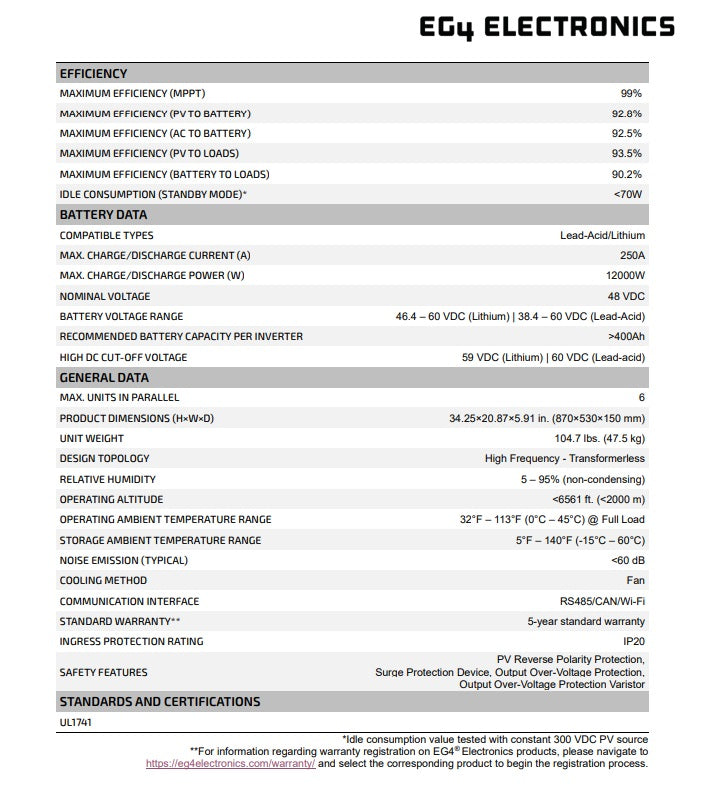 Equipado con un puerto para generador, el 12000XP cuenta con un sistema de arranque/parada automático de 2 cables y un puerto inteligente programable para control de carga inteligente o acoplamiento de CA. Se puede conectar en paralelo con hasta seis unidades para una salida total de 72 kW. Es una solución rentable para quienes no requieren reventa de la red y, con baterías EG4, proporciona un verdadero respaldo para toda la casa.