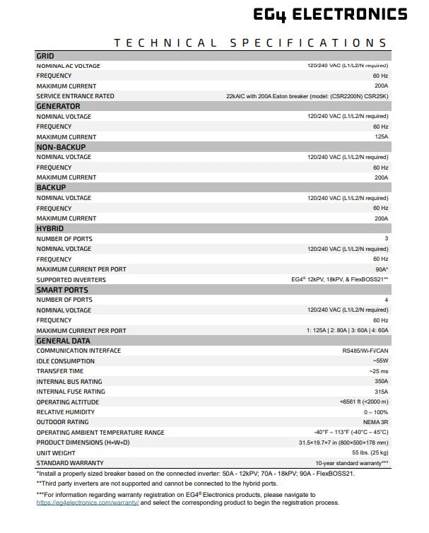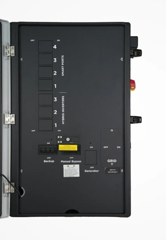 Entrada de servicio: hasta 200 A, 22 kAIC . Servicio de 200 A: Cargas de respaldo de 200 A y cargas sin respaldo de 200 A. Inversores híbridos: admiten hasta tres, con un máximo de 90 amperios cada uno. Puertos de acoplamiento de CA/inteligentes: 4 puertos para cargas inteligentes o acoplamiento de CA a 125 A, 80 A, 60 A y 60 A: hasta 125 A. Generador: hasta 125 A (30 kW) . Dimensiones: 31,5 × 19,7 × 7,0 pulgadas. Peso: 60 lb. Garantía: 10 años.