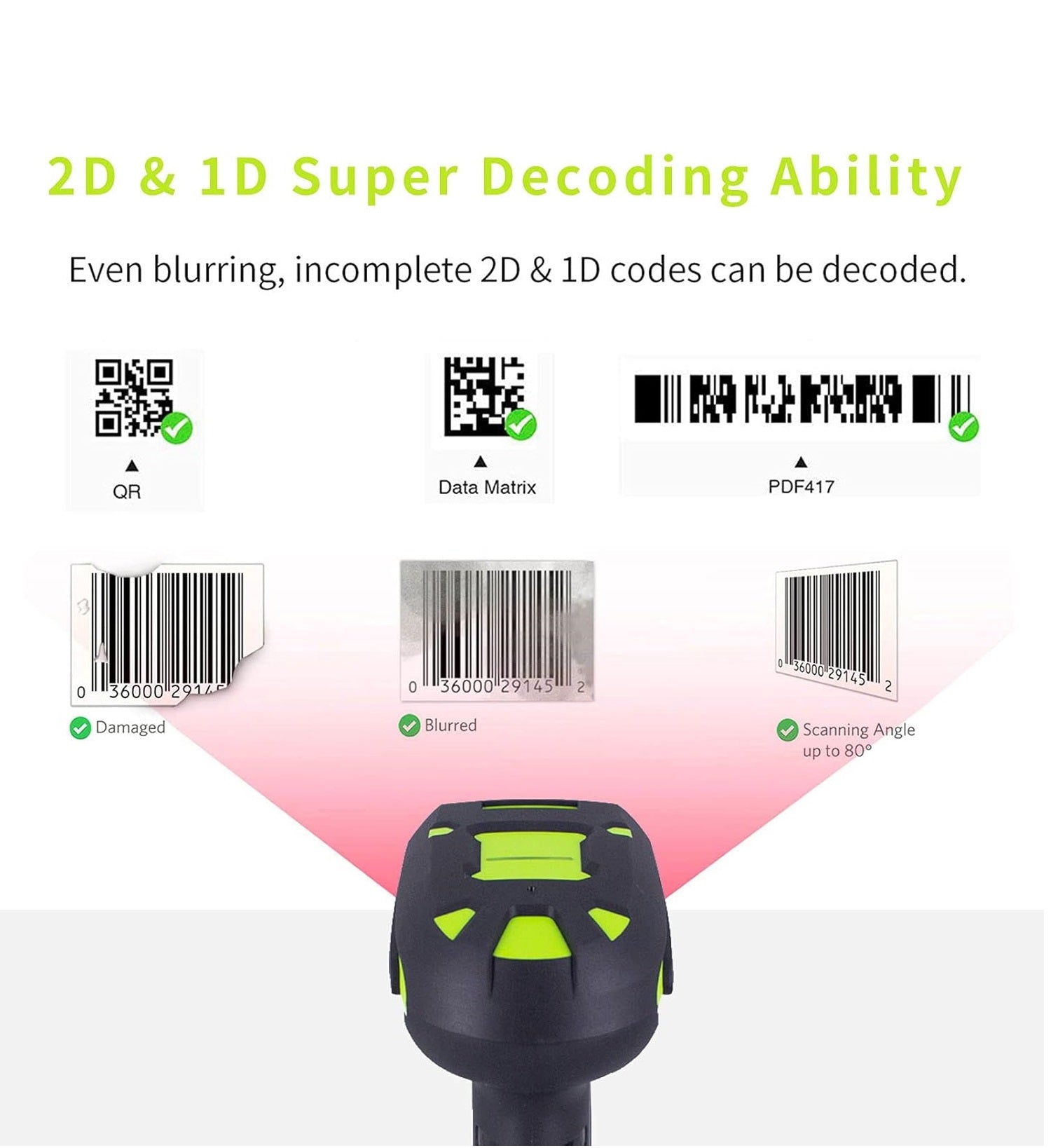 Escáner de código de barras 2D Bluetooth con soporte de carga inalámbrica, distancia de transmisión de 1468 pies, escáner de código de barras automático QR USB de 433 Mhz con base de carga, a prueba de golpes y polvo, manos libres, color verde